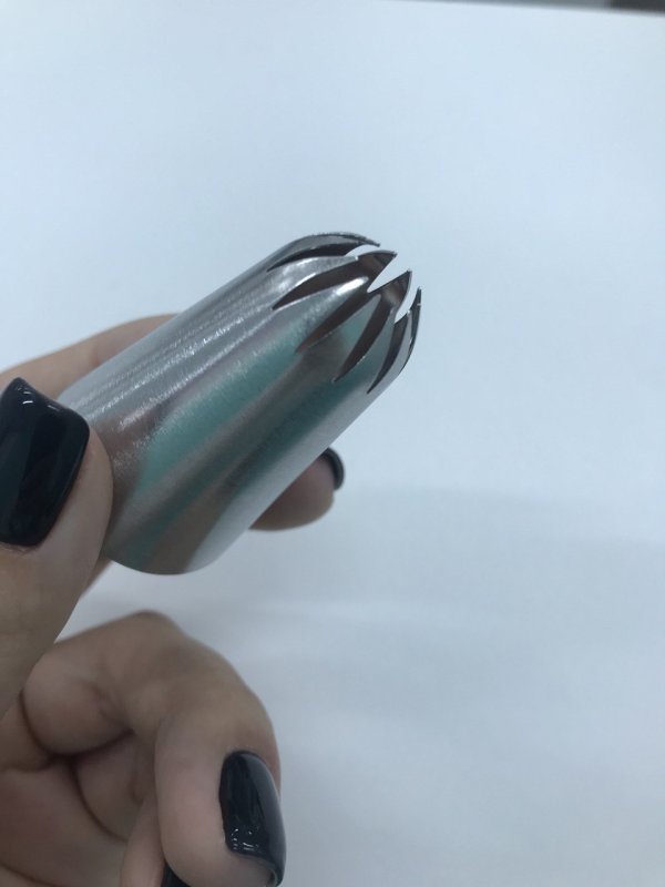 Одна из самых интересных насадок, которая есть в моем арсенале. Выполнена качественно, металл плотный. Отлично подходит для шапочек капкейков, печенья и кремового декора.