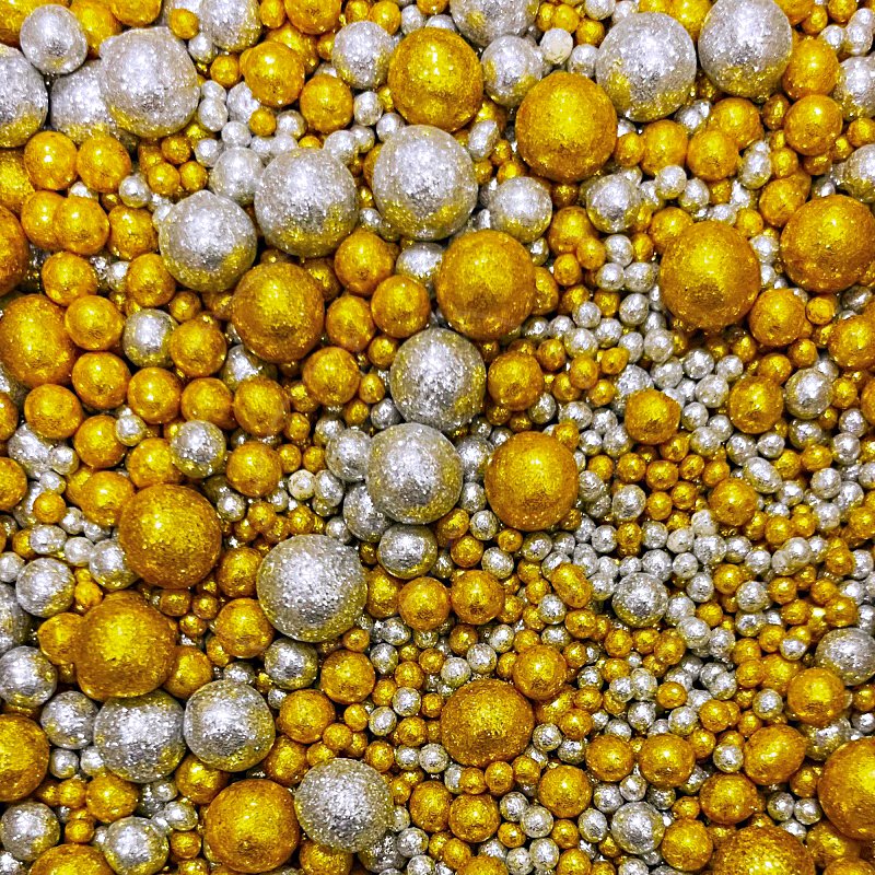 Жемчужная посыпка покрыта ярким пищевым блеском серебряного и золотого цвета.