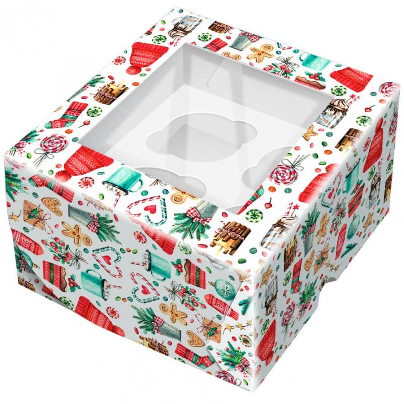 Доставка Коробка на 4 капкейка с окном "Новый Год" 16х16х10 см из магазина в вашем городе: