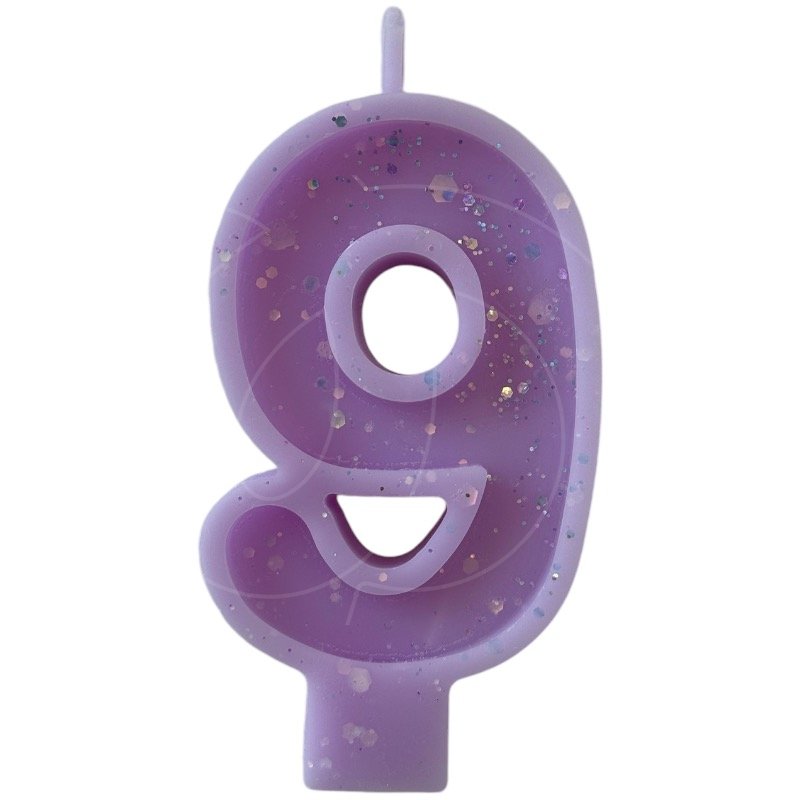 Свеча декоративная Цифра "9" Сиреневая с блёстками